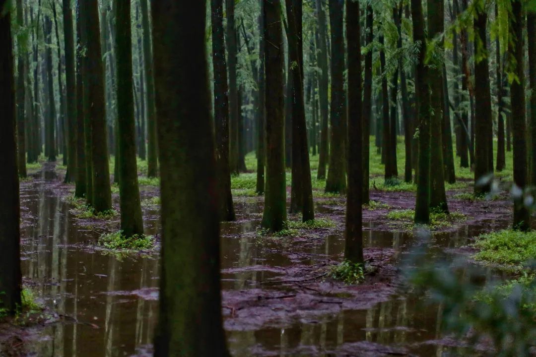 “杉木大道”呈三角形合围,其间地势起伏,种植了上千株池杉、水杉等乔木,路边两侧则是成片的八角金盘,高低错落,相映成趣。在“杉木大道”的池杉林中,树木高耸挺拔,浓荫匝地,一眼望不到森林的边际,宛若原始森林般透着寂静。