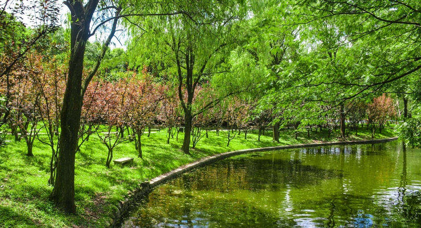 “花林大道”区域占地约65000㎡,位于共青森林公园东北部,四面被盈湖支流所环绕,四季景色怡人,是公园主要开花乔木的集中观赏地。盛夏时节,大面积的草坪和乔木,加上粗狂野趣的自然环境,营造出一个充满森林地貌特征的避暑纳凉好去处。