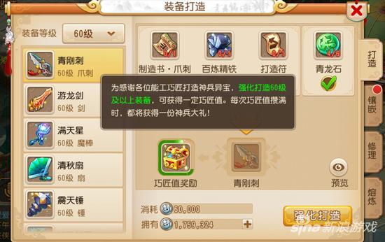 玩家在打造60级及以上装备的时候,都能获得一定的巧匠值,当巧匠值满了以后,就能获得巧匠值礼包,玩家能在巧匠值礼包中获得残缺的洗炼石、百炼精铁以及制造书等奖励。