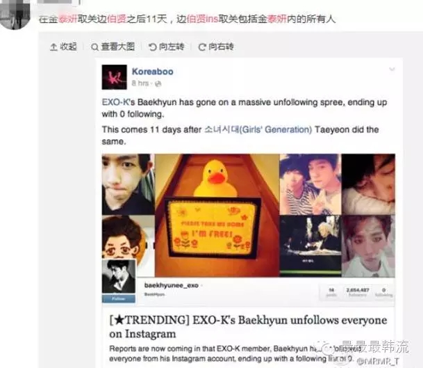 如果两个人一直走下去也倒好了,可是在2014年11月,泰妍取消了EXO成员的全部关注,其中也包括边伯贤……不久之后,伯贤也取消了所有人的关注……这是受到了怎样的伤害啊
