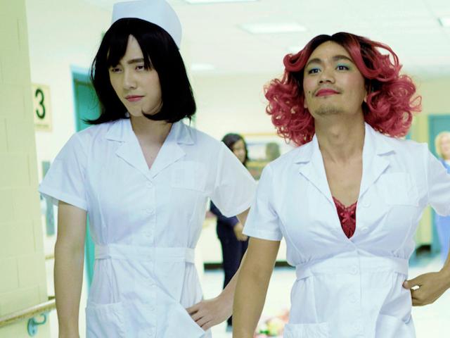 穿着白大褂,戴着护士帽,黑色的短发与肩平齐,还有睫毛和淡妆,没想到刘昊然穿上这一身还很不错,给人的感觉应该是很性感的。反观身旁的王宝强,就略微奔放一点,但突出的是笑点,这都可以理解。