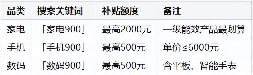 手机数码类:搜索「手机900」或「数码900」,最高补贴 500 元(限 6000 元以下机型)