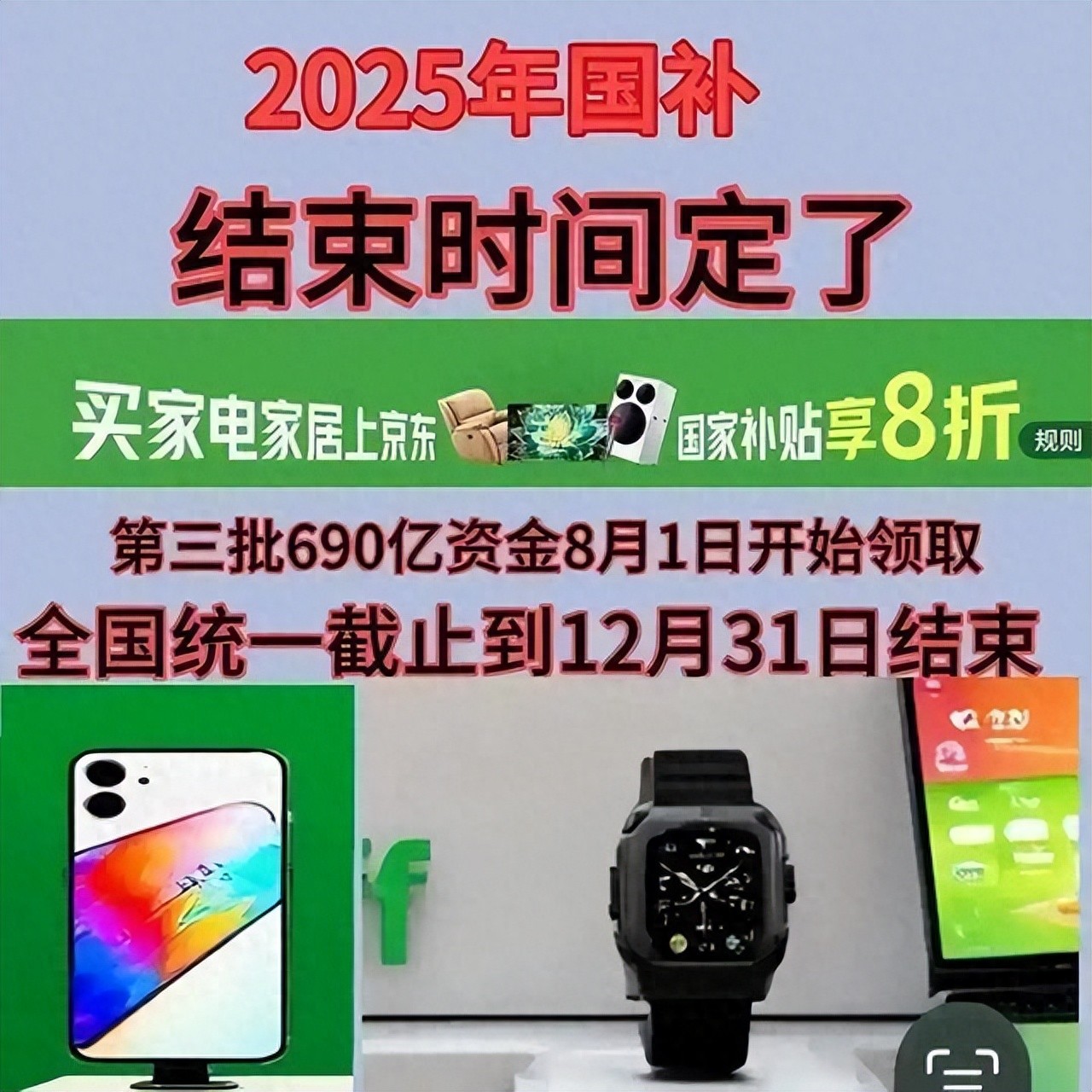 最后提醒:2025年国补仅剩不到4个月,第四批690亿元资金将于10月1日下达,预计“双11”前迎来新一轮抢券高峰。想换手机、家电的朋友,现在就是最好时机!
