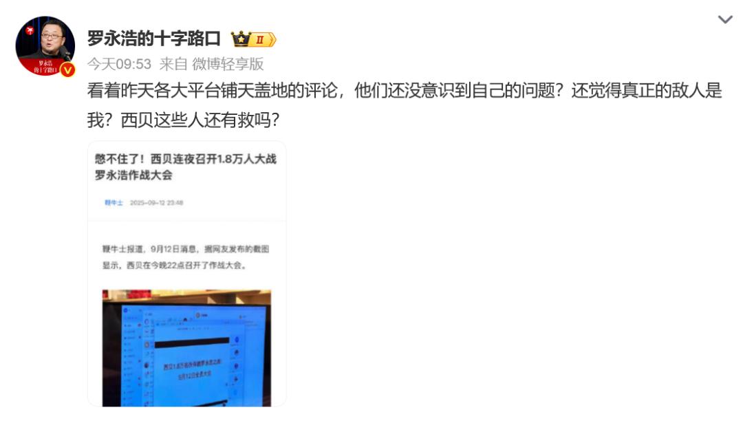 9月13日上午,罗永浩转发一则“西贝召开1.8万人罗永浩作战大会”的稿件截图,并评价:“西贝这些人没救了”“西贝真正的敌人不是我”。