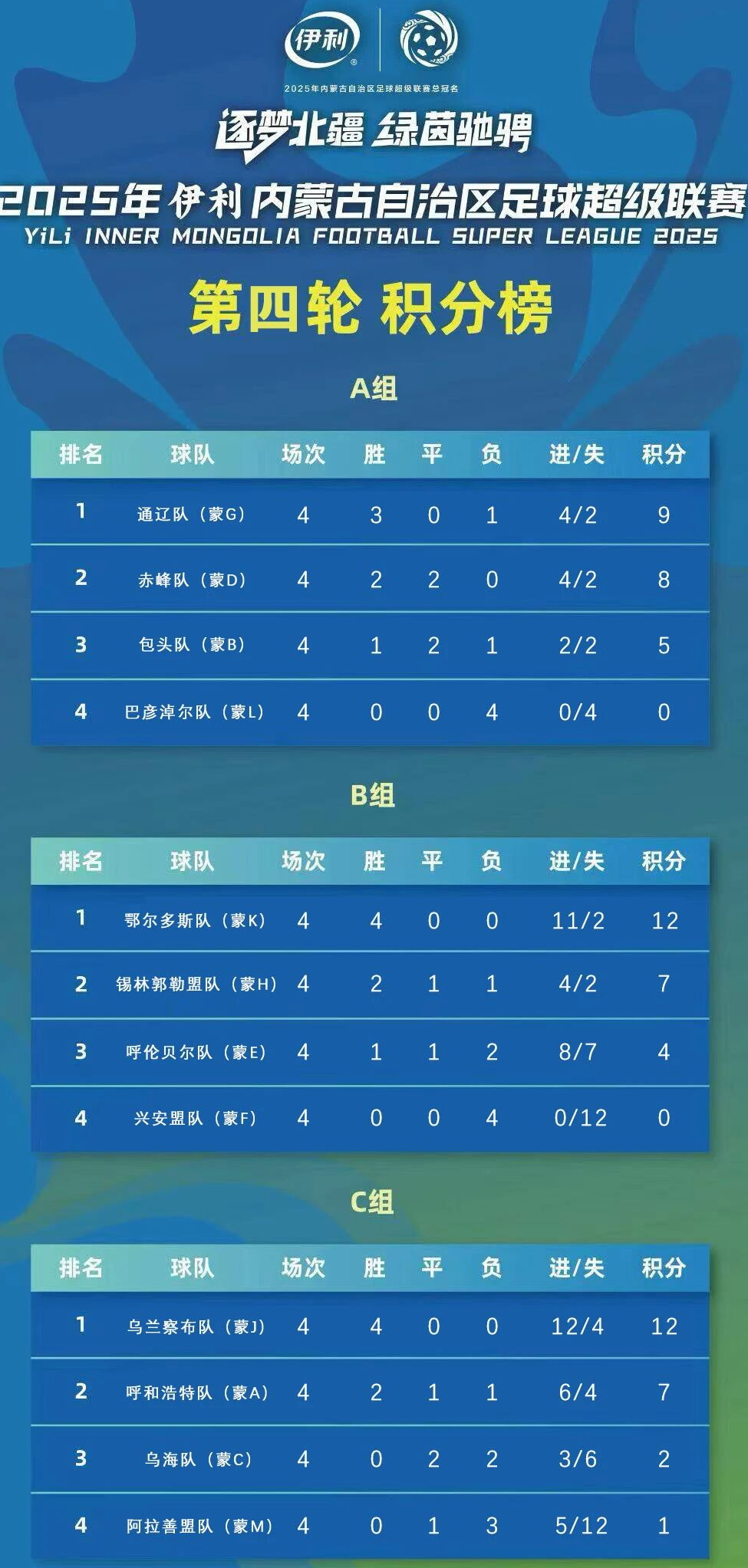 蒙超(2025内蒙古自治区足球超级联赛)第4轮全部打完,蒙超最新积分榜,包头呼和浩特皆平(包呼皆平),鄂尔多斯险胜,也终于丢球了(首丢球),乌兰察布大胜,前中超球员梅开二度。