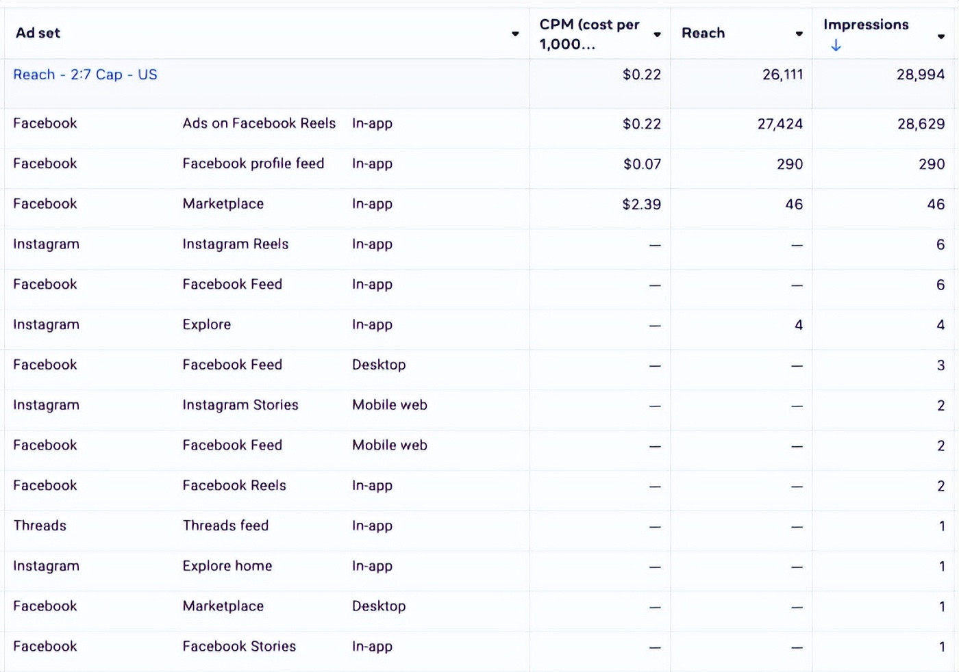 既然转化、深度互动都不指望它,又恰逢大量库存,竞价池自然冷清,Meta 随便就能挑出没人争的便宜展示。于是,用这里来完成“刷到就算赢”的知名度目标,门槛被压到最低——22 美分的 CPM 也就说得通了。