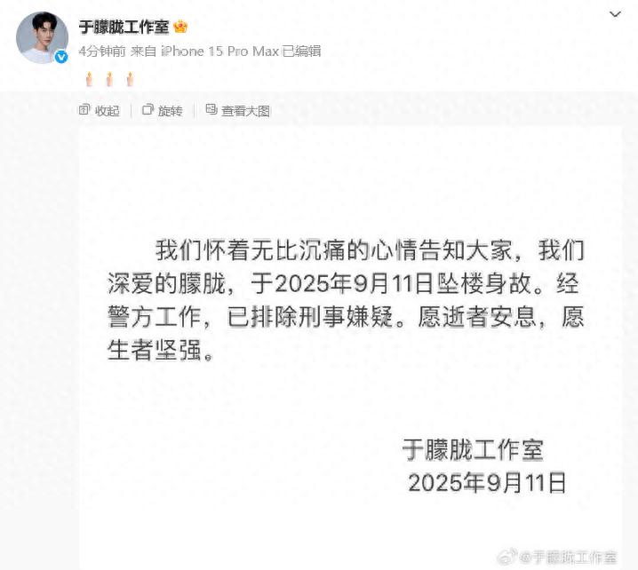 演员于朦胧工作室发布讣告:于朦胧于2025年9月11日坠楼身故,已排除刑事嫌疑