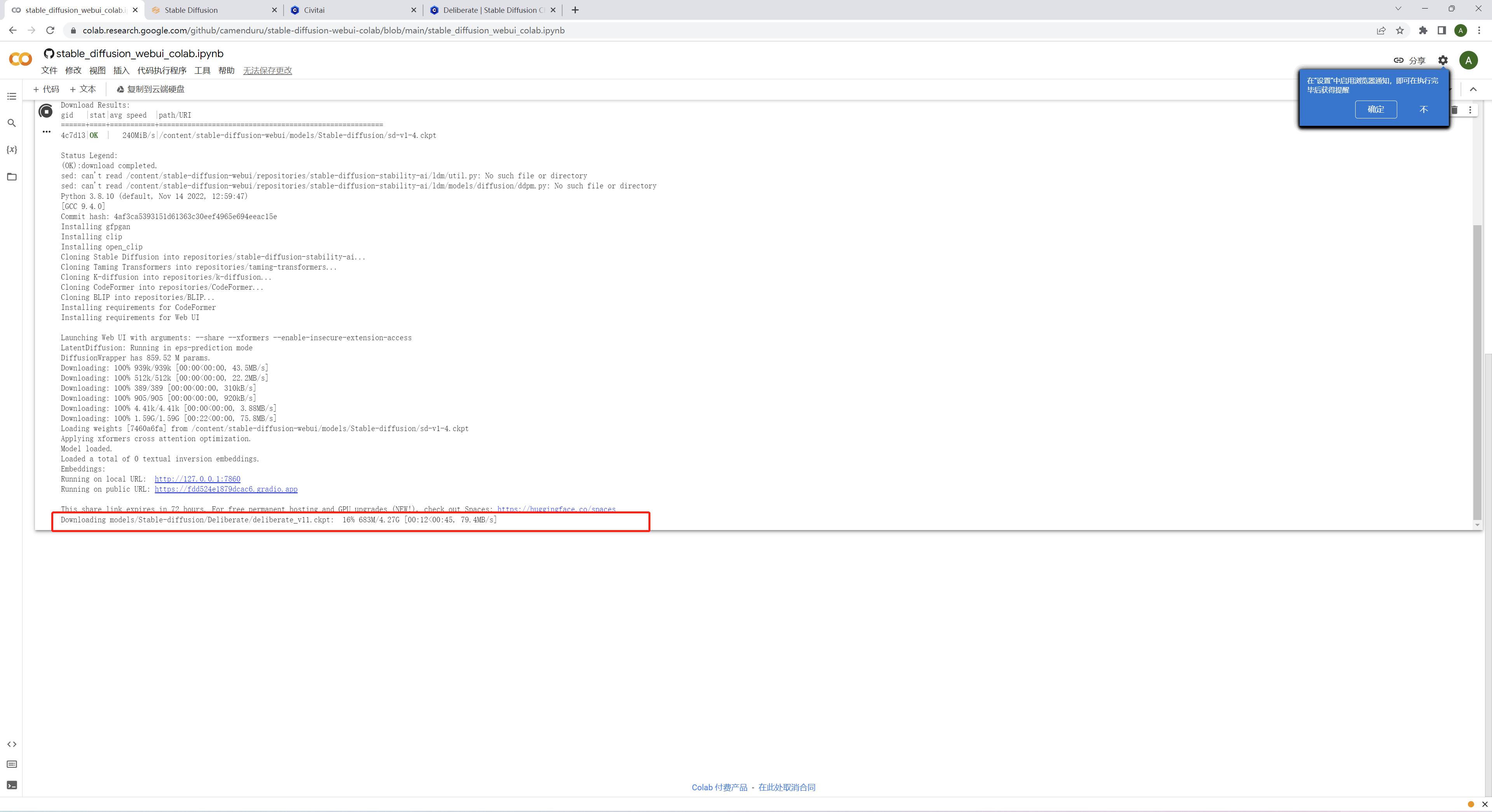 此时就是漫长的等待,这种大类的模型动辄几个G,小水管承受不起- -你可以返回Colab页面查看下载进度