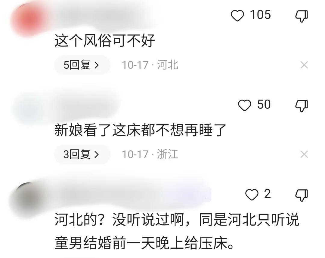 很多网友也表示这种方式并不可取,有人也表示新娘看了这床都不想再睡了。很多地方也有“新婚压床”这种风俗。一般会在新人床上摆上花生、红枣、桂圆、莲子之类的干果。寓意“早生贵子”、“子孙满堂”,象征着家庭的繁荣和兴旺。这种温和的方式既能祝福新人又能体现文化内涵。