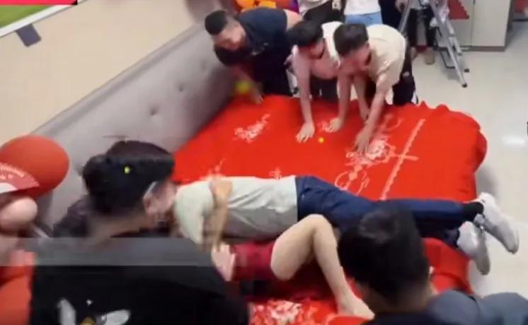 近日河北一对新人婚礼上一个穿红色旗袍的“喜婆婆”躺在新人床上说“老公来吧”,“喜公公”马上扑了上去,众人伸手将两人在床上推来推去,旁边的人还在起哄拍手叫好,怎么看都有点辣眼睛。