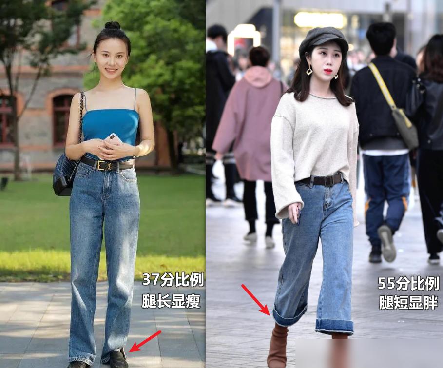 因此, 我们在选择牛仔裤时要考虑整体的比例,选择与上身相协调的裤宽,这样才能打造出完美的身形。