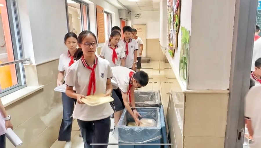 田林三中两个校区共有1800多名学生,如何让选餐、取餐更有序?开学前夕,学校提前一周向学生和家长公示午餐菜谱,供学生和家长选择。开学首日,教室里就贴上了开学第一周班里同学的选餐情况。午餐时分,同学们根据选餐名单,到教室外取餐。在取餐的同时,同学们也参与自我管理。