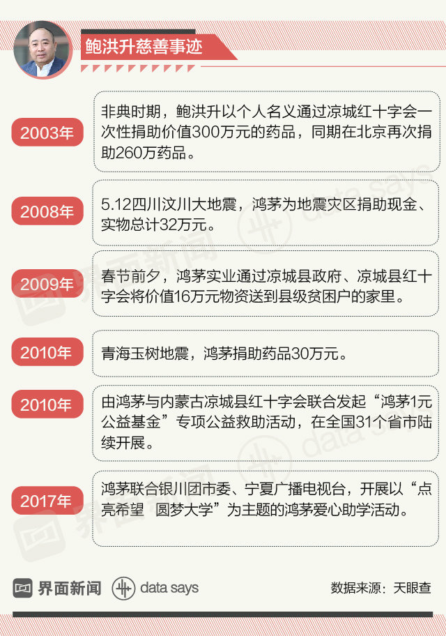 此外,鲍洪升个人经常参与慈善事件。加入内蒙古鸿茅实业股份有限公司后,也推动企业参与慈善事业。