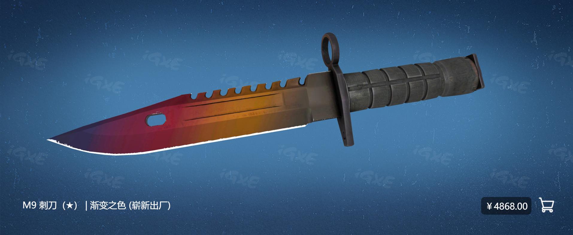CSGO里除了枪的皮肤,呢就是刀的皮肤了,因为刀可以甩来甩去,看上去很酷炫,我最喜欢的就是这把M9刺刀,切换的时候在手里转一圈,这把渐变之色的M9刺刀在交易市场里售价4800~5000元。