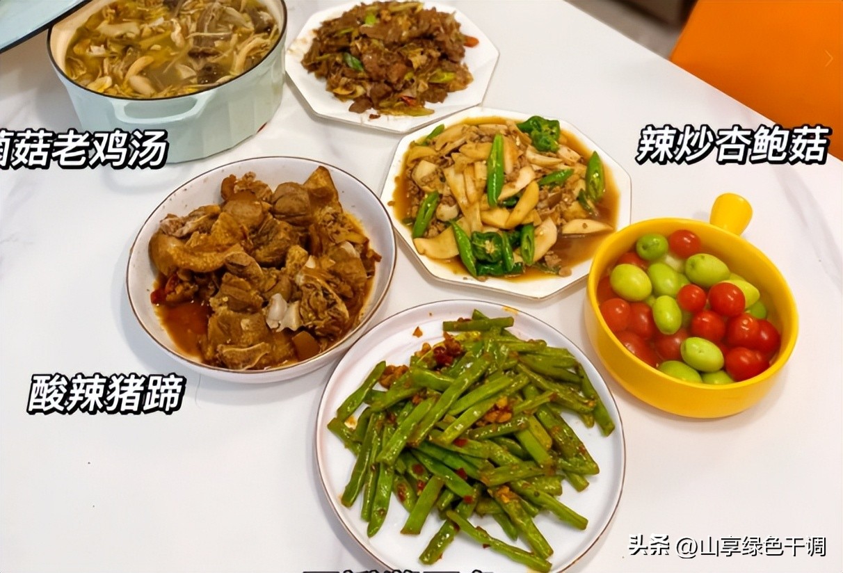 周四:大葱孜然牛肉、辣炒杏鲍菇、豆瓣酱豆角、菌菇老鸡汤