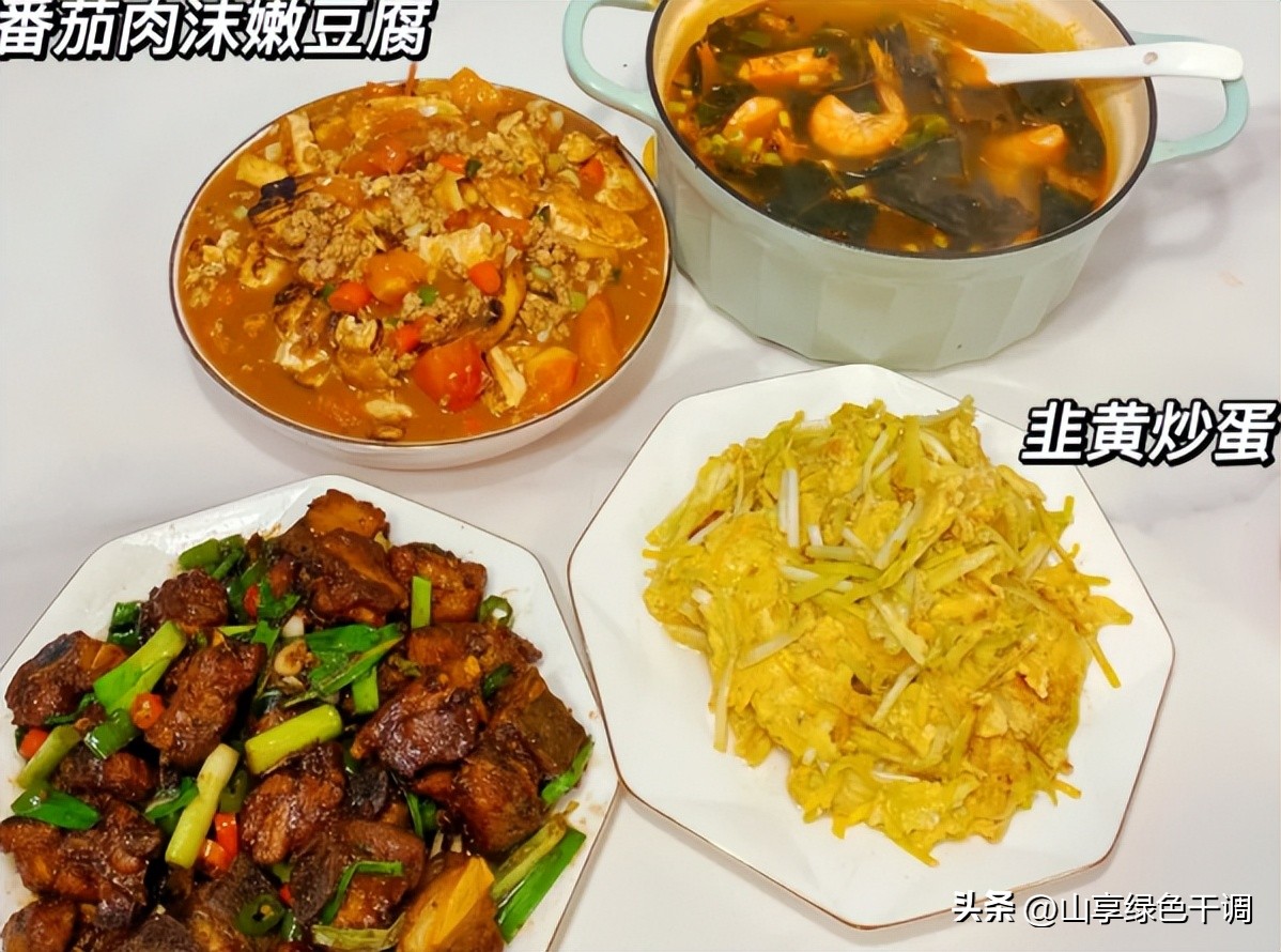 周二:生炒排骨、番茄肉沫嫩豆腐、韭黄炒蛋、鲜虾裙带菜汤