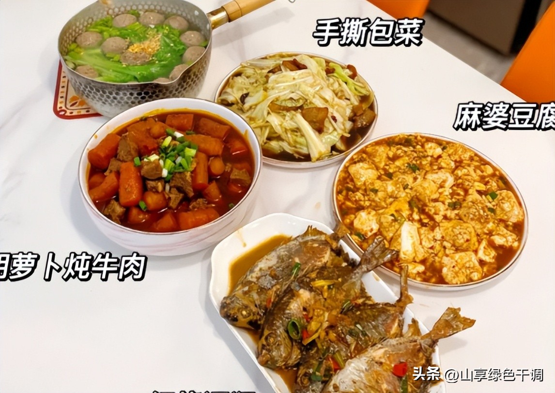 周五:胡萝卜炖牛肉、麻婆豆腐、手撕包菜、手打牛肉丸汤
