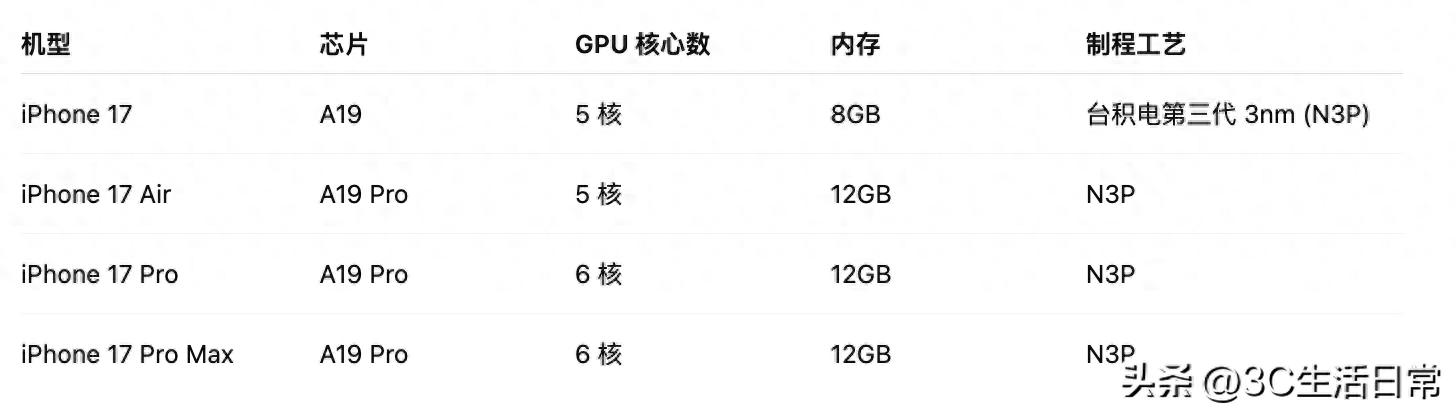 先看下四款 iPhone 17 系列的芯片配置: