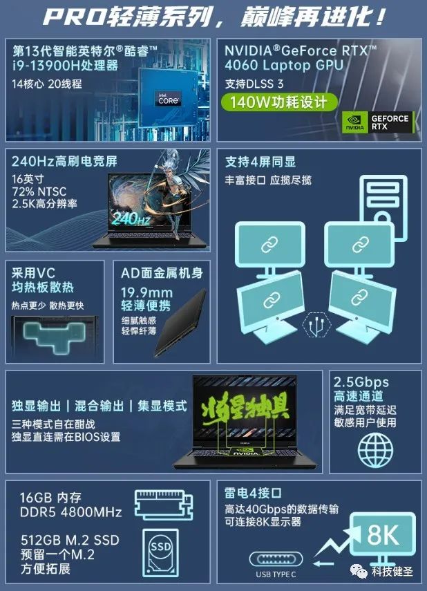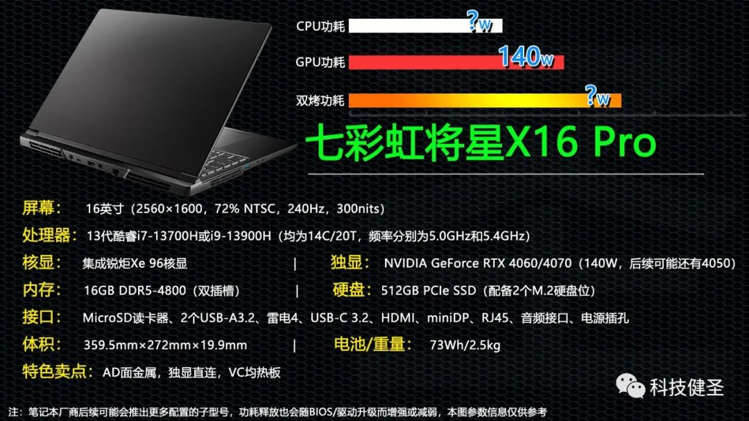 将星X16 Pro,或者说是蓝天PE60系列公模最大的特色,就是内置双风扇和超大面积的VC均热板,配备4个出风口,内置2个DDR5内存插槽和2个M.2硬盘位。目前还不清楚该产品的CPU单烤和双烤功耗,感兴趣的同学可以关注下网上的后续评测。