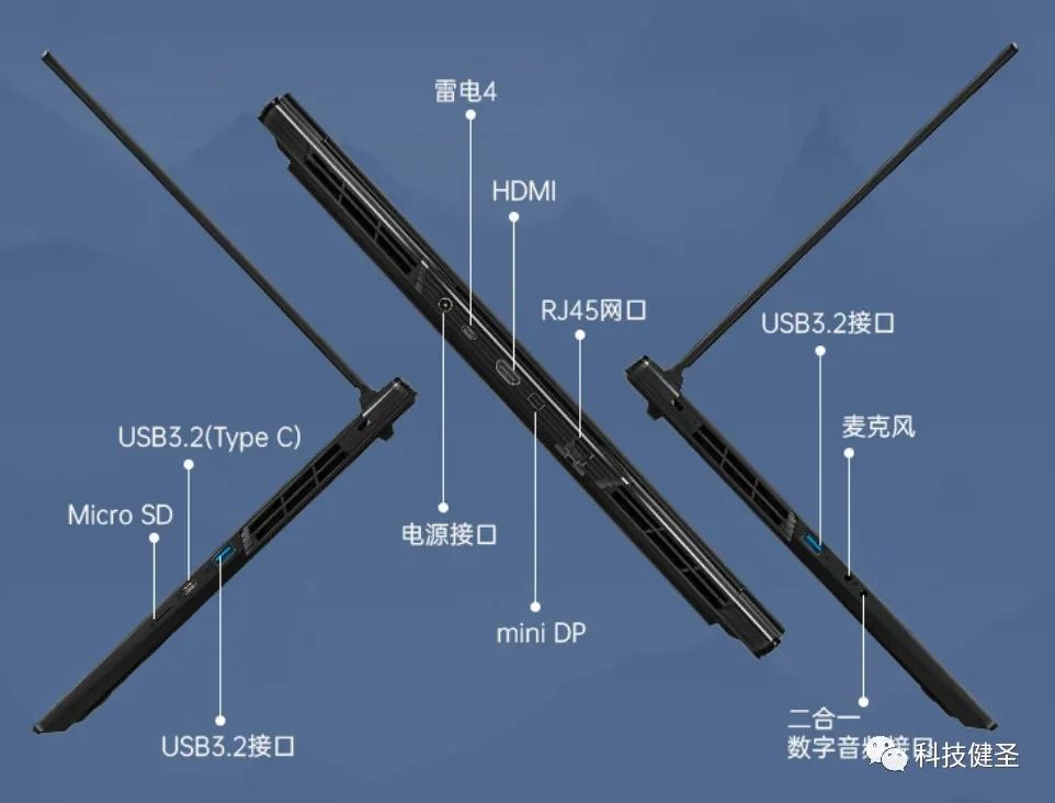 将星X16 Pro的接口数量与将星X15系列相似,只是布局略有差异,包含MicroSD读卡器、2个USB-A3.2(速度不明)、雷电4、USB-C 3.2(速度不明)、HDMI、miniDP、RJ45、音频接口、电源插孔,可以实现四屏同时显示。
