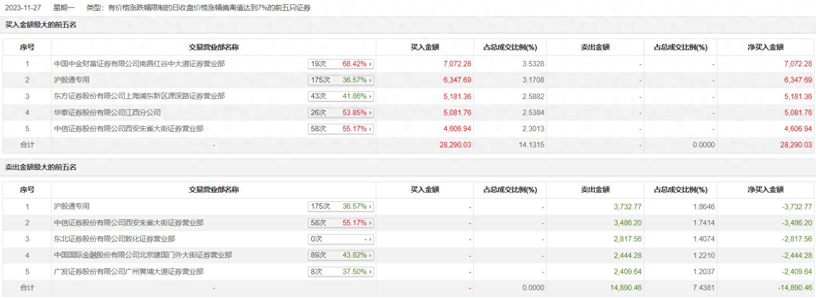 吉视传媒11月27日涨停,全天换手率达24.68%,振幅达10.09%。龙虎榜数据显示,营业部席位合计净买入1.34亿元。其中,中国中金财富证券有限公司南昌红谷中大道证券营业部、沪股通专用分别买入7072.28万元、6347.69万元;沪股通专用、方新侠(中信证券西安朱雀大街证券营业部)分别卖出3732.77万元、3486.20万元。