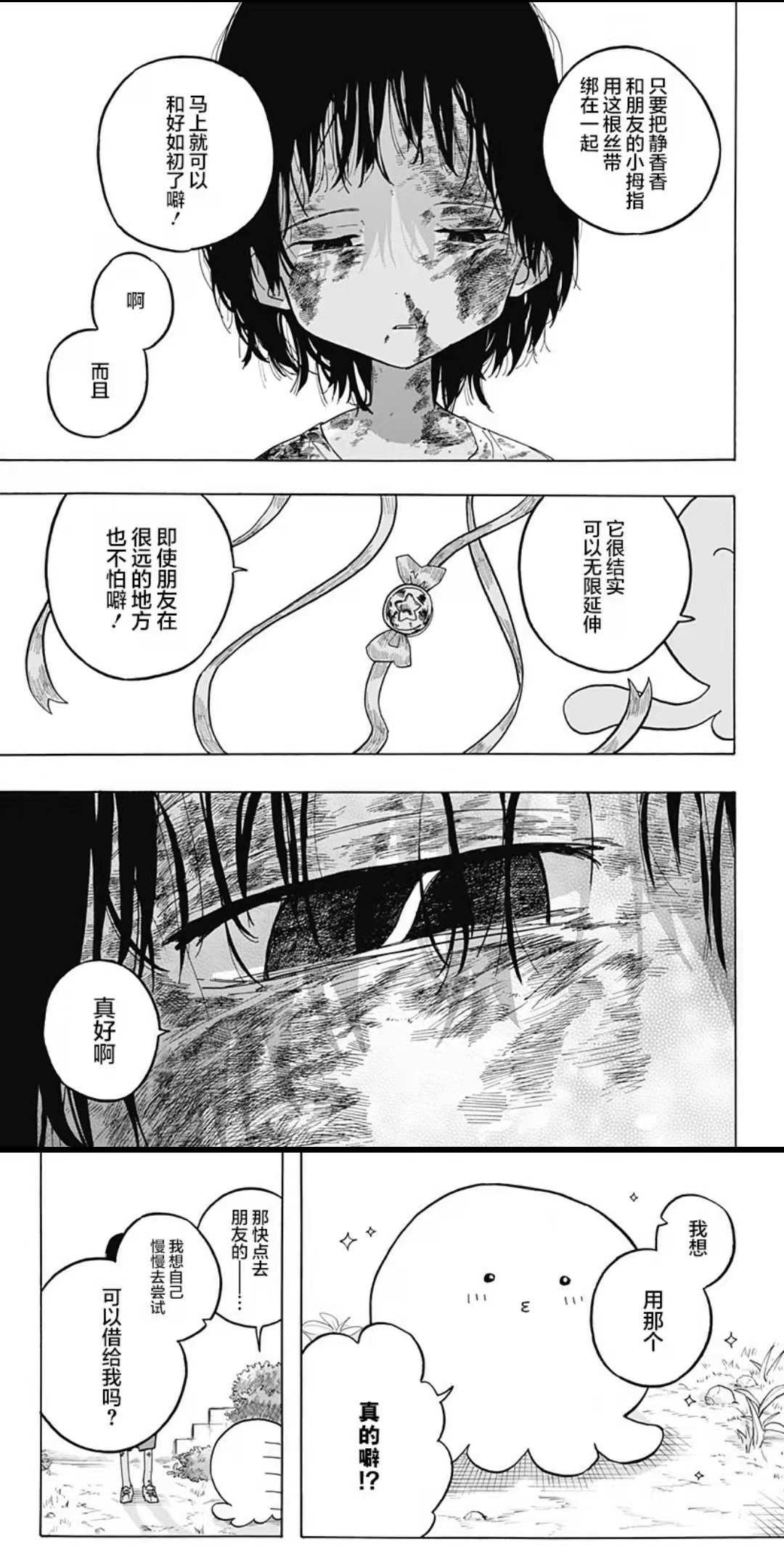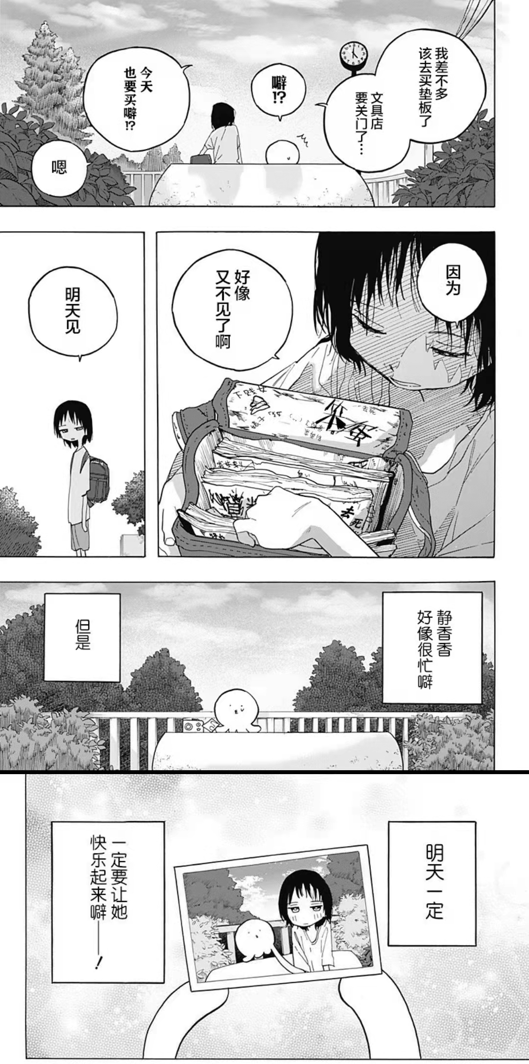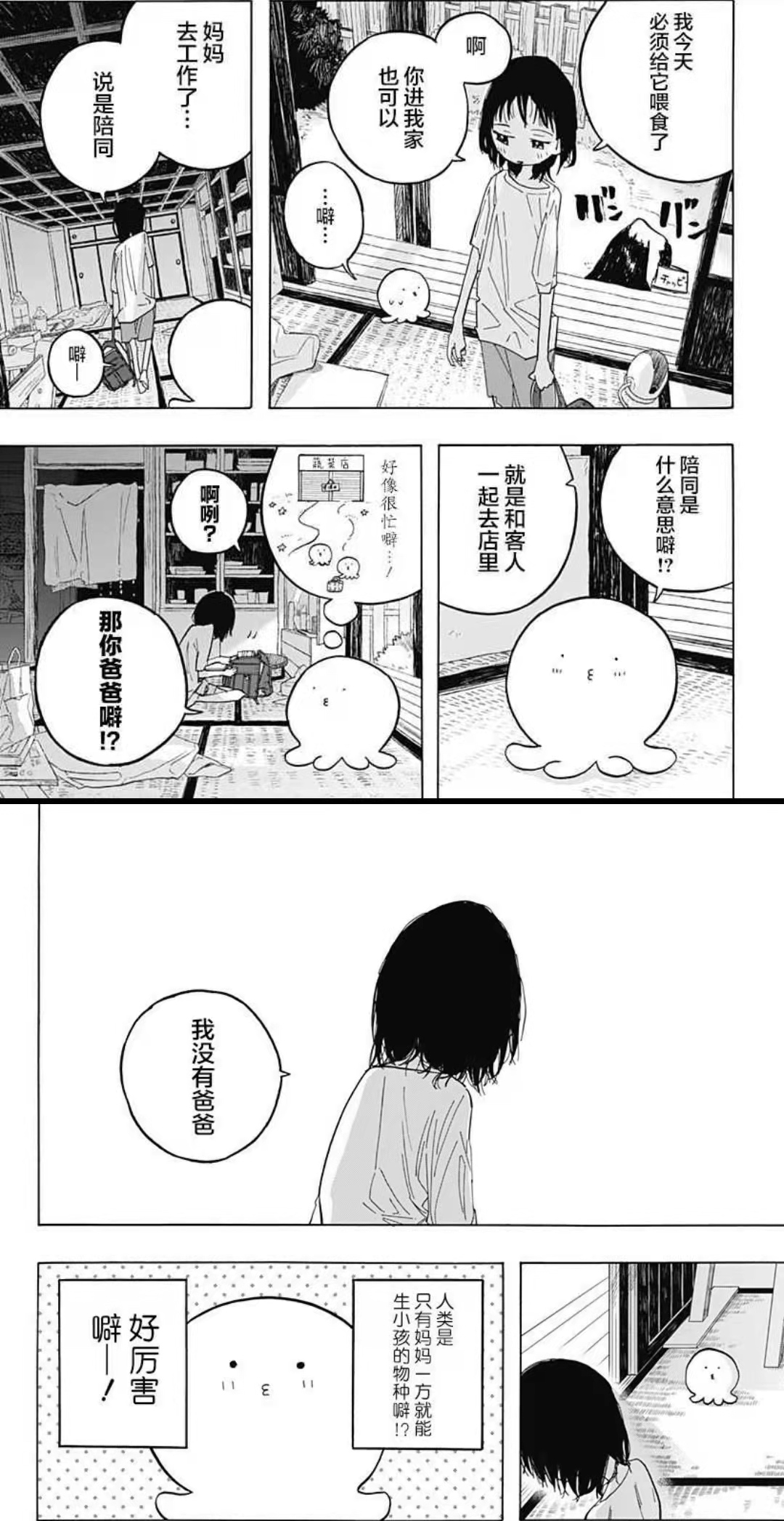 故事的人物有些像哆啦A梦与大雄,当然如果和静香香比,大雄就是在蜜罐里长大的。静香香的身处破碎而贫穷的家庭,缺少陪伴与爱的孤独以及被校园霸凌的苦楚,在章鱼噼过于天真的眼中,显得尤为凄惨。