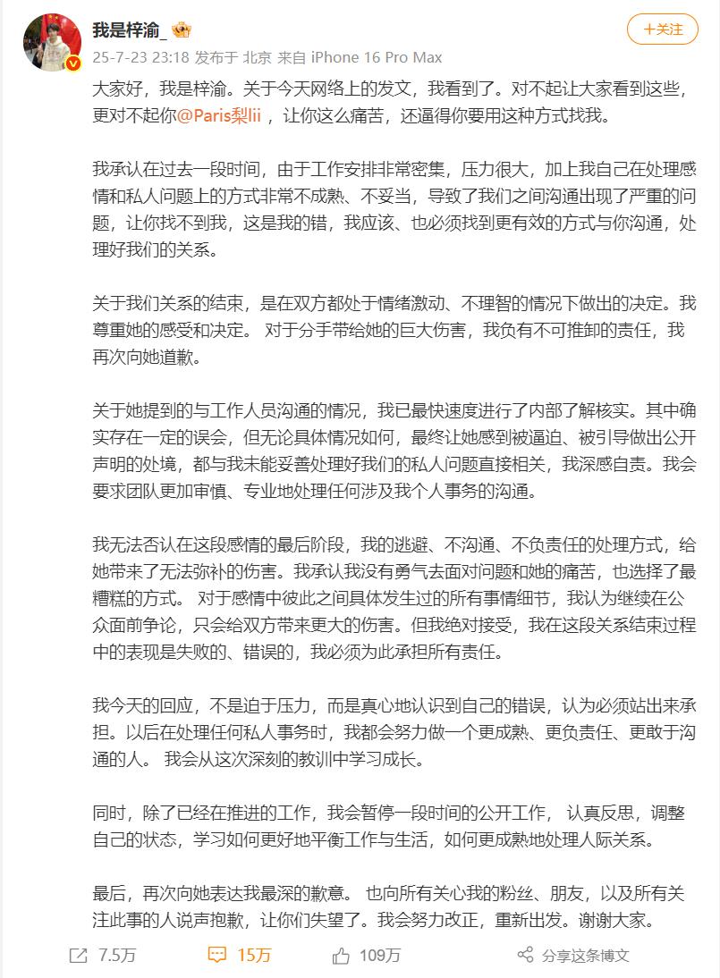 女子控诉男星梓渝隐瞒恋爱、冷暴力……刚刚,梓渝发文道歉:会暂停一段时间的公开工作