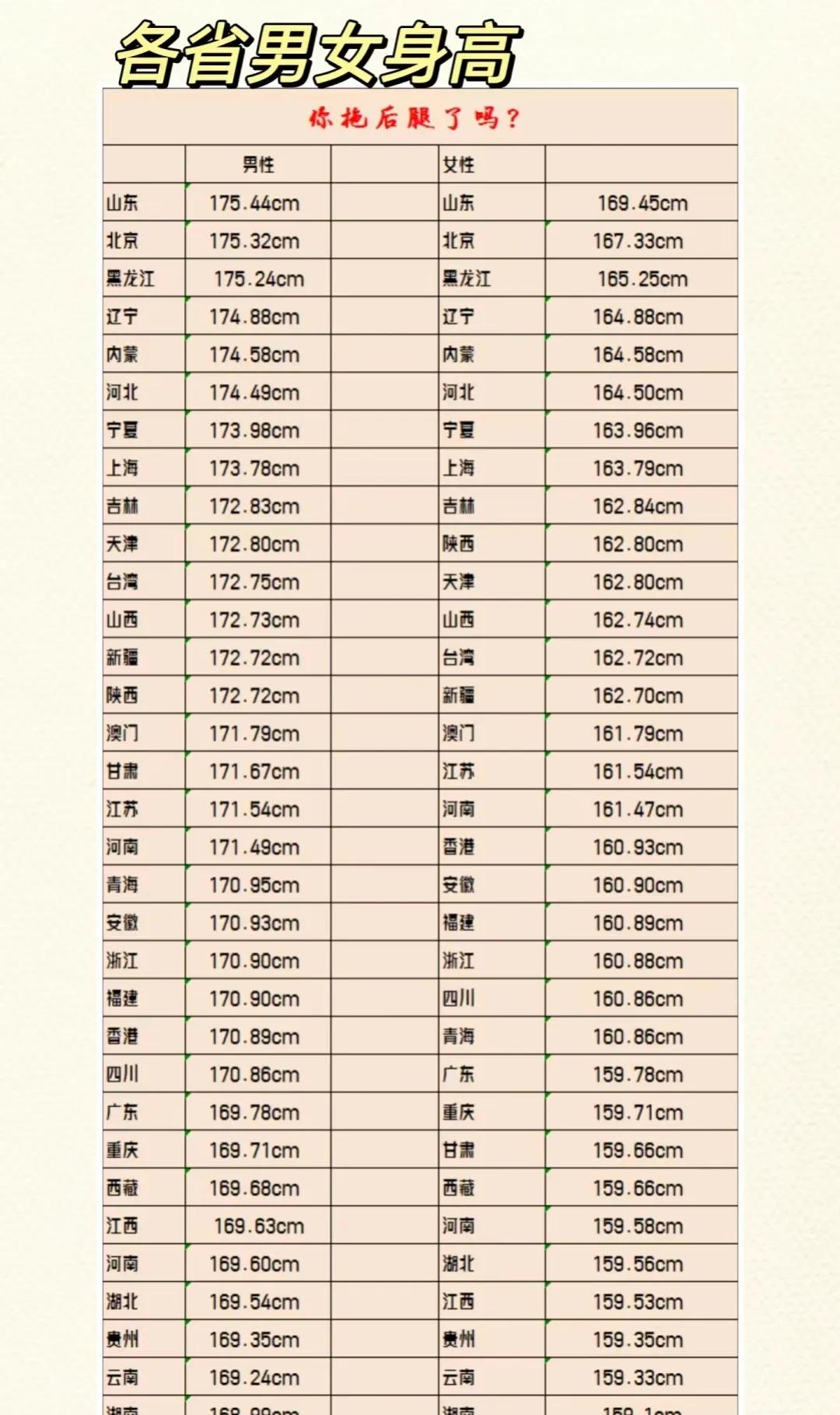各省男女身高比例,没想到最高的竟然是它!
