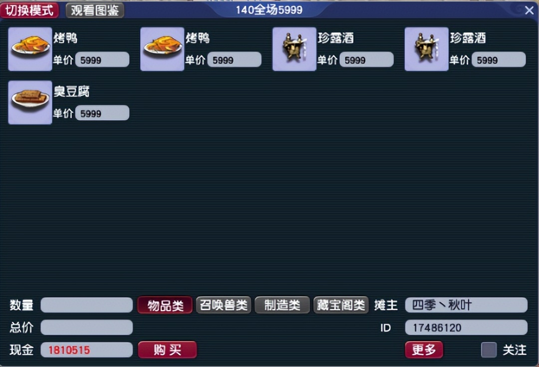 如果仓库中的低价值烹饪(烤鸭、珍露酒、烤肉、臭豆腐、佛跳墙)太多,刷任务已经无法消耗掉,那么接下来只能去摆摊处理了。我把低价值烹饪和高品质醉生梦死(135以上)分为摆摊类烹饪,只要价格合理,它们是非常好卖的。