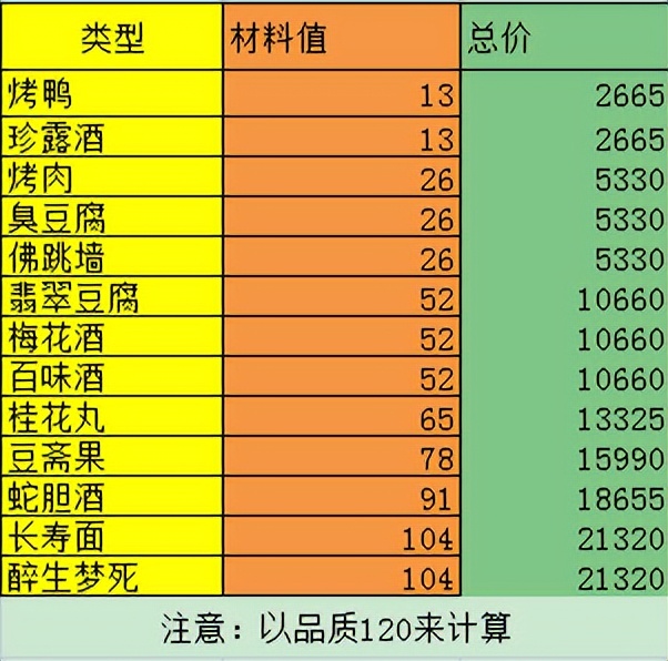 这张表对寿命类烹饪的价格也有影响,桂花丸低于1.3W不要卖、长寿面低于2.1W不要卖。