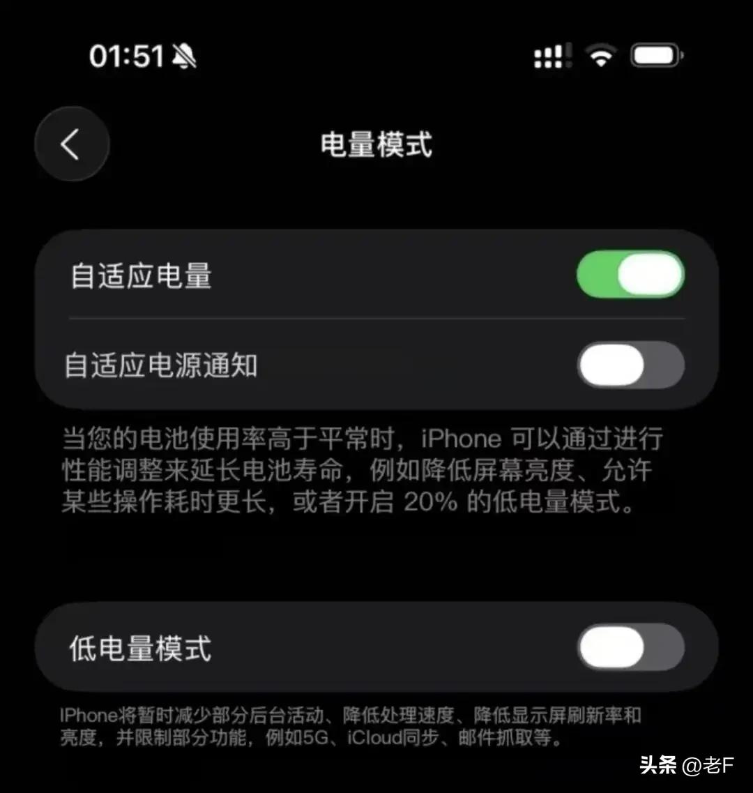 iPhone 15 Pro及以上机型有福了!系统会自动降性能省电,还能发通知提醒:“亲,您已进入节能模式,性能降低20%哦”。