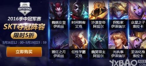 2016年季中冠军赛已经结束,SKT以3:0的绝对优势夺得冠军。即日起至5月19日,冠军阵容的五款英雄与皮肤将开启限时五折销售,赶快与冠军共享这荣耀时刻吧!