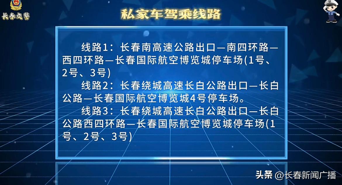 李贺说:"私家车出行线路线路一,长春南高速公路出口至南四环路至西四环路,到长春国际航空博览城停车场1、2、3号。线路二,长春绕城高速,长白公路出口至长白公路到长春国际航空博览城4号停车场。线路三,长春绕城高速长白公路出口至长白公路,西四环路到长春国际航空博览城停车场1、2、3号。"