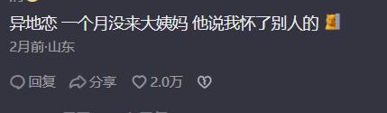 1、“异地恋 一个月没来大姨妈 他说我怀了别人的”