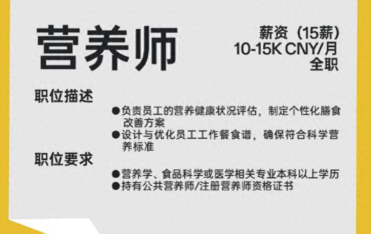影视飓风表示,营养师职位主要负责员工的营养健康状况评估,制定个性化膳食改善方案,设计与优化员工工作食谱,确保符合科学营养标准,月薪10-15k。