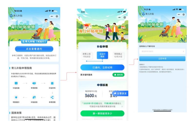 已订阅邀约用户进入微信“育儿补贴”小程序,点击“已邀约,立即试用”,即可完成在线申领。