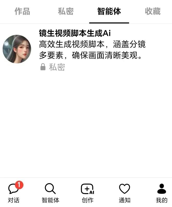 然后进入AI智能体设定界面。为智能体上传一张图片作为形象(我上传了一张美女图),建一个名称,此案例中就名“镜生视频脚本生成Ai”吧,声音嘛,权限嘛,公开或私密的,随便选一项。这些设定都不重要。最重要的是“设定描述”。