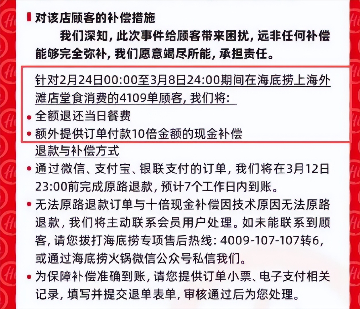 陆陆续续的海底捞顾客开始了自己的维权,短短半个月就有超4000桌的人申请索要赔偿,按照海底捞“退一赔十”的措施,其款项将也可达2000多万元。