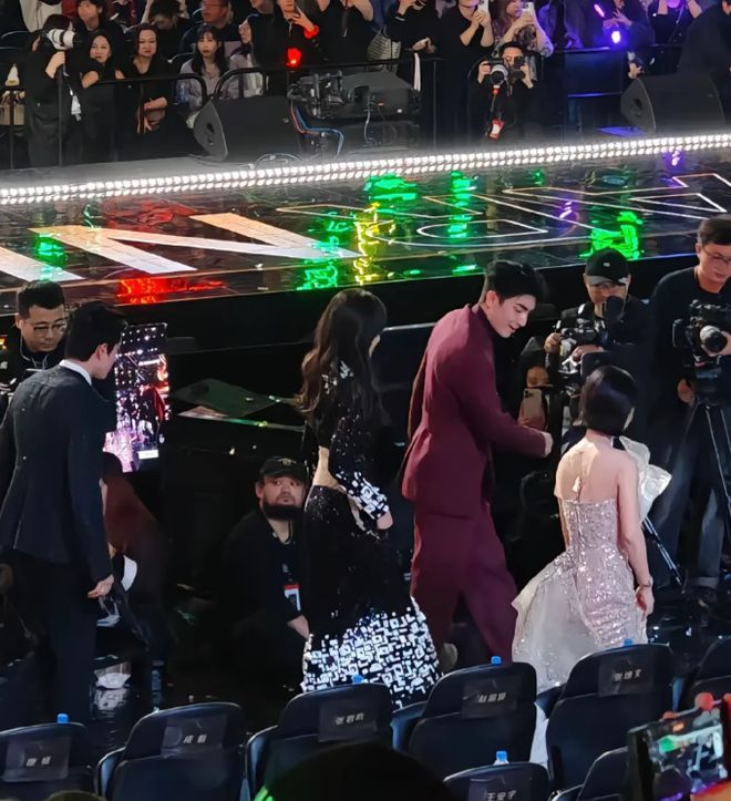 某个颁奖晚会,林更新赵丽颖一起起身,男方的眼里都是赵丽颖,还不忘记给人家提裙子!