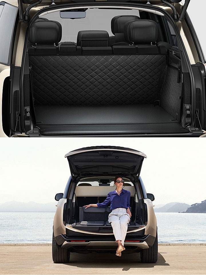 车尾则是此代揽胜在造型最大的变革处,横置的揽胜字样如今内嵌在横贯车尾两侧黑色饰条中,其饰条内其实整合方向灯组,而尾灯组则改为两侧直立式的 LED 灯条,形成类ㄇ字型的视觉,尾灯在开门时会有动态的灯光展演。而车系经典的分离式尾门依旧,支援感应式电动开启机能外还会同步降低气压悬挂高度,另可选配类劳斯莱斯库里南的 Tailgate Event Suite 座椅套件,开启后尾门的折叠式座椅可形成两张座椅,让成员能舒适乘坐在下尾门处享受户外时光。