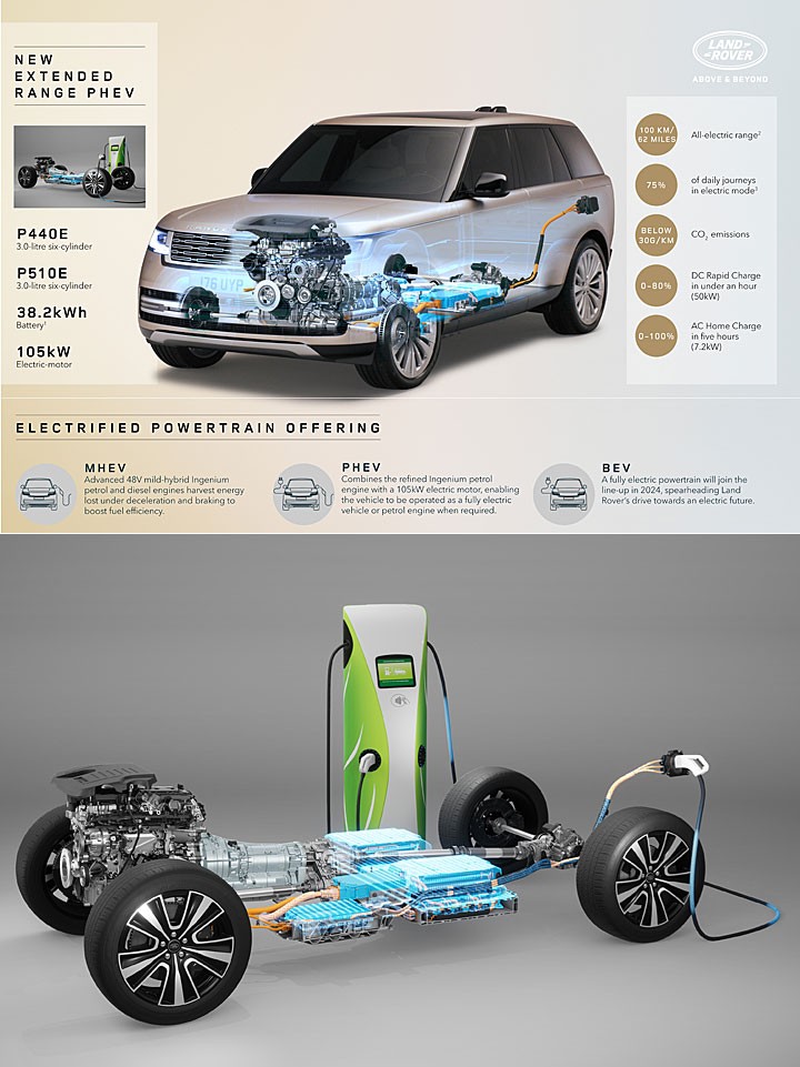第 5 代揽胜动力最大亮点在全新的 PHEV 插电式油电混合车型,提供 P440e、P510e 共两种动力选择,P440e 可同步在短轴/长轴搭载、P510e 则是仅提供短轴。两种动力全数搭载 3.0 升直列 6 缸 Ingenium 涡轮增压引擎,搭配功率 105kW 的电动马达,38.2kWh 锂电池组(实际可用容量 31.8kWh),P440e 车型可输出 440 匹马力,P510e 车型则提高到 510 匹。两款车型的 WLTP 纯电续航里程可达到 100 公里、实际纯电行驶约莫在 80 公里,CO2 排放量达到 30 g/km,使用 7.2kW AC 家用充电器充电可在 5 小时内充满电池。P440e、P510e 还另支援 50kW DC 直流电充电,可在 1 小时内完成充电至 80%。