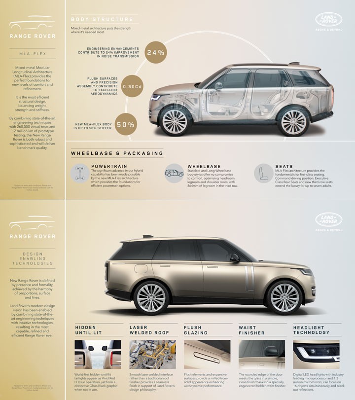 第 5 代揽胜车系最大变革在于改搭全新的 MLA-Flex(Modular Longitudinal Architectrure)平台架构,其亮点为可同时对应燃油、MHEV 轻油电、PHEV 插电式油电混和、甚至是 BEV 纯电动等多元动力,而新一代揽胜首波除纯电版外、其余动力选项都已在原厂产品序列中现身,纯电版则预告依照集团新全球策略「Reimagine」下、会于 2024 年正式推出。全新的 MLA-Flex 平台在车身仍有多达 85%采用铝合金材质,车顶更是首度采用雷射焊接工艺制造、拥有更为平整的接缝,并强调其刚性相较前代提升 50%、车内噪音静肃性也比前代减少 24%,风阻系数更是最低可来到 0.30 cd。
