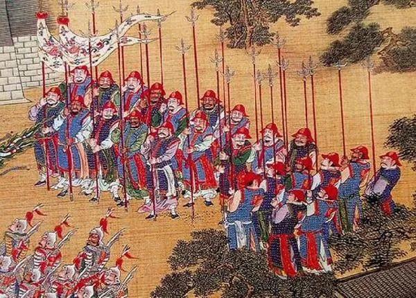 所以在宋徽宗来查看禁军操练的时候,高俅就会让禁军横列四色彩舟,让禁军军士穿上颜色鲜艳的衣服,手持各色大旗、棹刀、盾牌等器具列队反复穿插。
