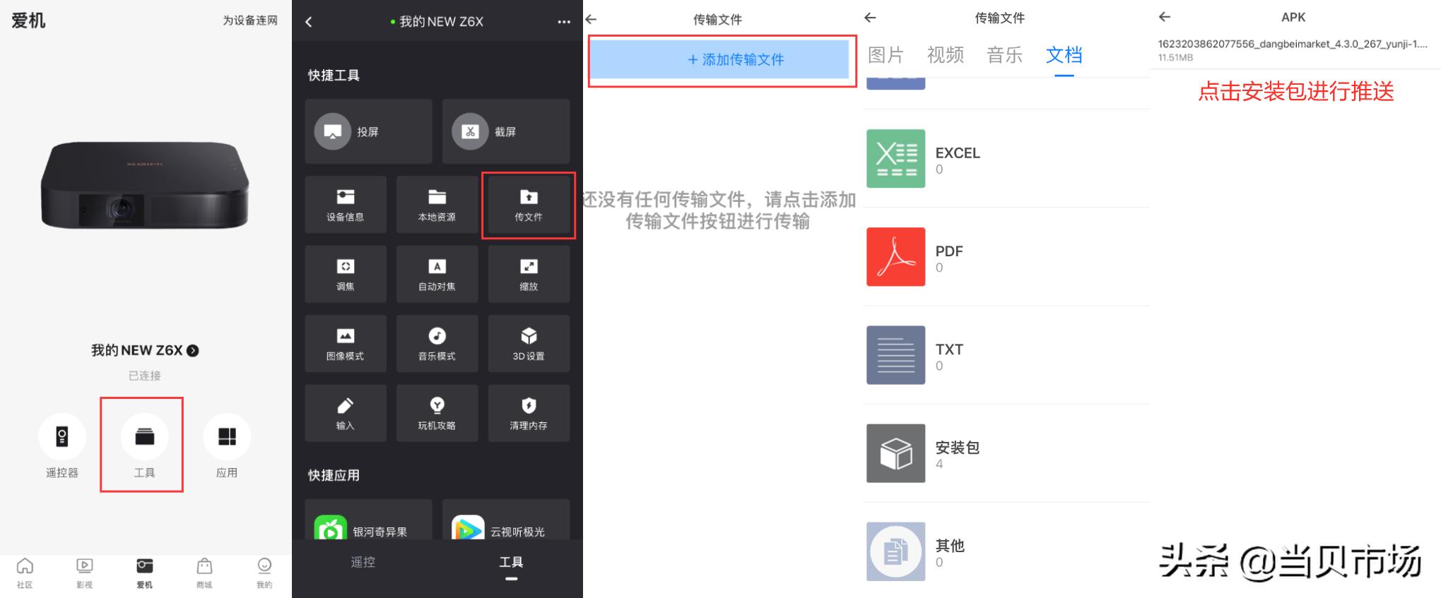 重新回到手机端的【极米】,找到工具里的传文件功能,选择添加传输文件,找到下载好的安装包,点击进行推送。