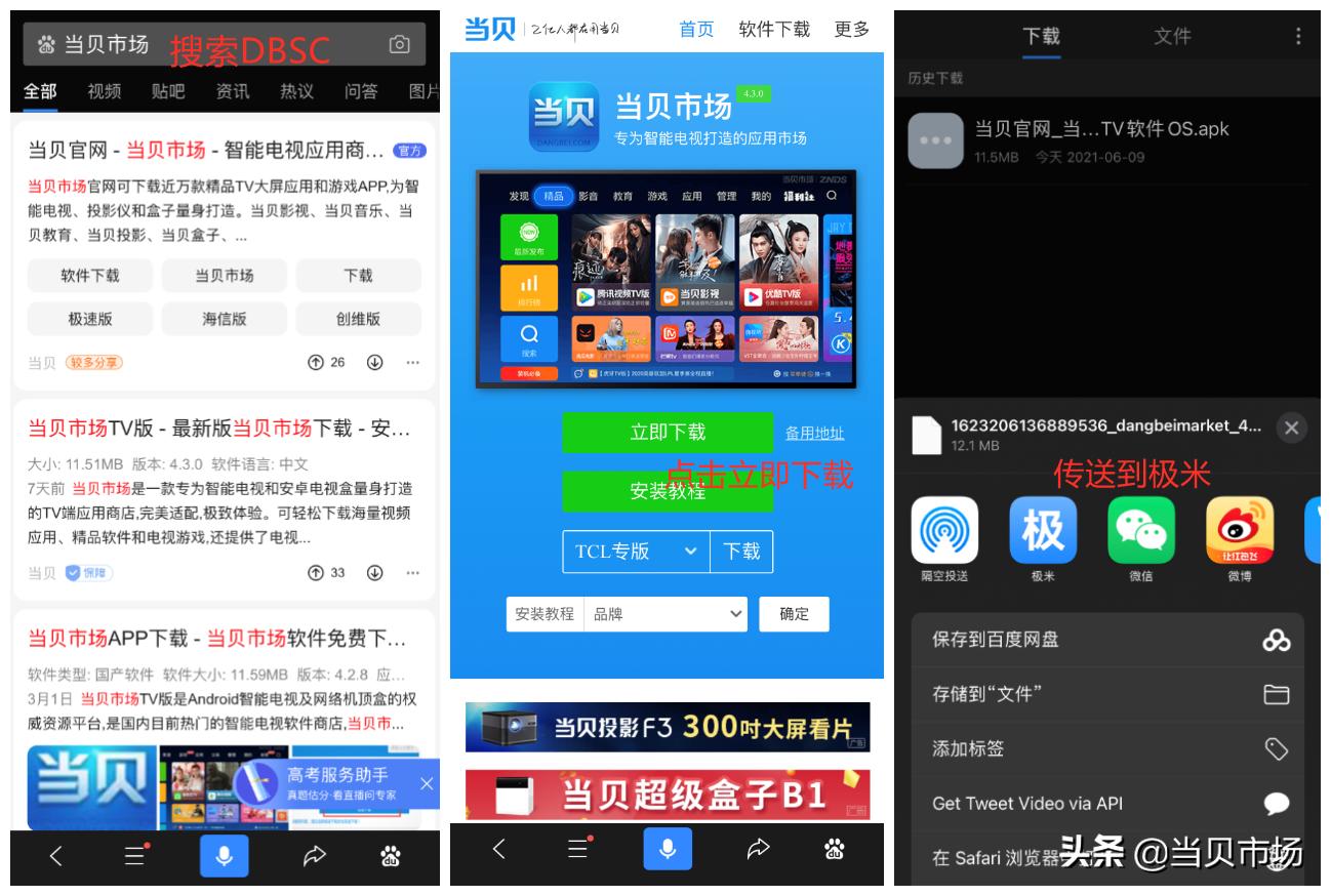 在手机端打开百度,搜索DBSC,找到当贝市场官网,选择下载当贝市场的安装包。完成后点击安装包,将其推送至手机端的【极米】