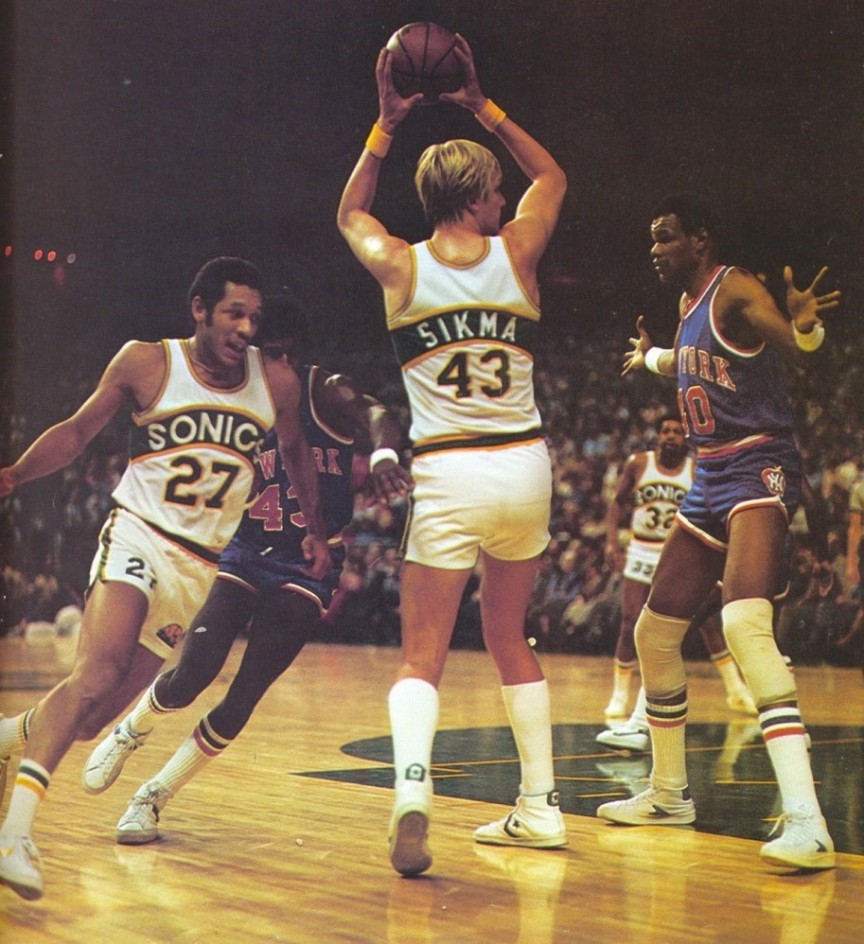杰克·希克马(密尔沃基雄鹿队)Jack Sikma正是队中的领袖。来自Illinois Wesleyan大学身高6英尺11英寸的的Sikma在1977年的选秀大会上在第8顺位被超音速队选中。在接下来的9个赛季中,Sikma一直是球队的先发中锋。在这9个赛季中,有6个赛季他都参加了全部的82场比赛。他职业生涯一共只缺席了23场比赛。