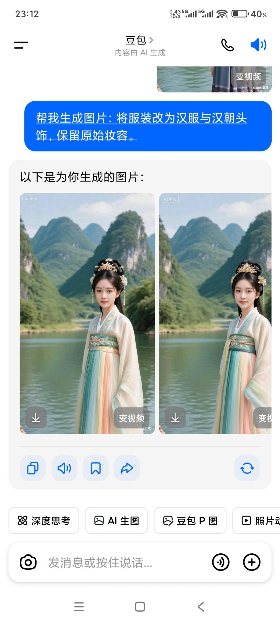 P图片指令:将服装改为汉服与汉朝头饰,保留原始妆容