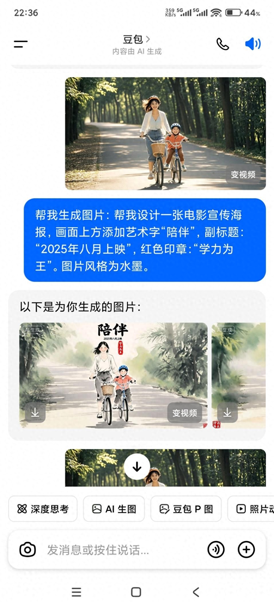 1、帮我设计一张电影宣传海报,画面上方添加艺术字“陪伴”,副标题“2025上映”,红色印章“学力为王”