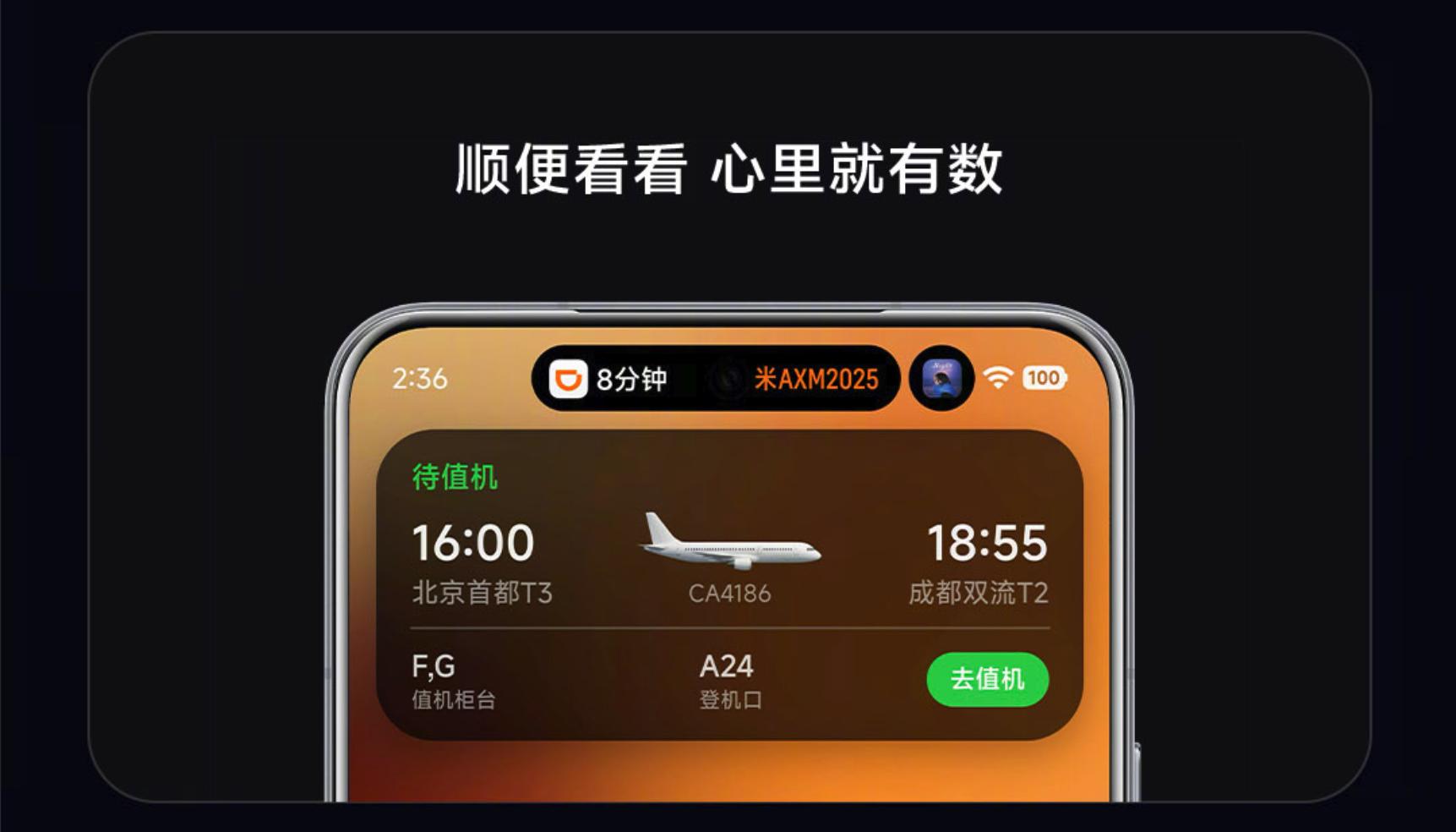 此外,小米超级岛还支持信息顺畅切换,为用户完整呈现最关注的信息;不用终止当前应用,下拉小窗就可以查看完整信息;行程信息还能拖拽分享给好友。
