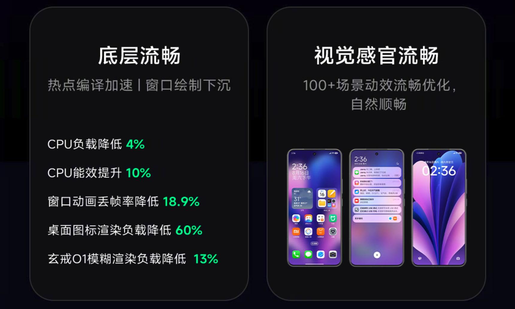 HyperOS 3 第一个核心目标就是更流畅更稳定,HyperOS 3 叠加自研芯片,针对热点函数做编译优化,窗口动画绘制下沉至系统层,使全场景能效提升,降低了渲染负载,在底层技术之上,优化了100+系统动效,提升动画的流畅性和稳定性。